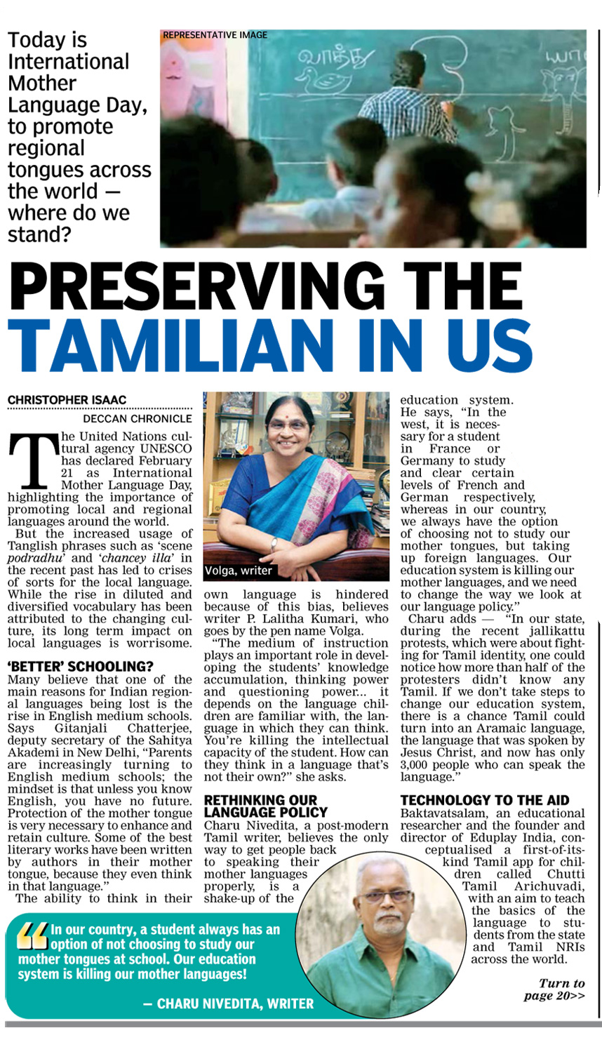 Charu adds – “In our state, during the recent jallikattu protests, which were about fighting for Tamil identity, one could notice how more than half of the protesters didn’t know any Tamil. If we don’t take steps to change our educational system, there is a chance Tamil could turn into Aramaic language, the language that was spoken by Jesus Christ, and now has only 3000 people who can speak the language.”